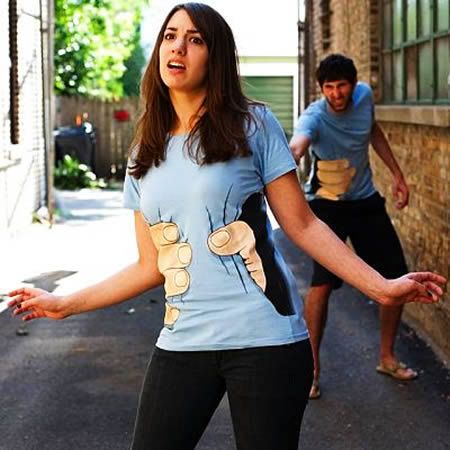 Itulah salah satu ilusi keren dari kaos ini. Dengan menggunakan layar kecil yang terhubung dengan DVD yang dihidupkan dan diletakkan di perut, serta kamera video yang terikat di belakang punggungnya, ia benar-benar berhasil menciptakan ilusi lubang besar di perut . .